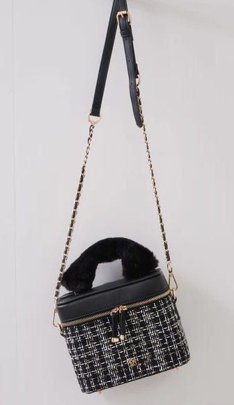 ファーハンドルキルティング&ツイードバニティバッグ