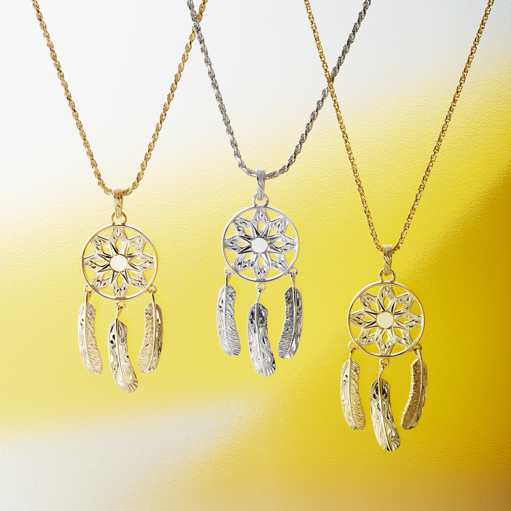 このドリームキャッチャーの美しいデザインをハワイアンジュエリーネックレスとして製作しました。