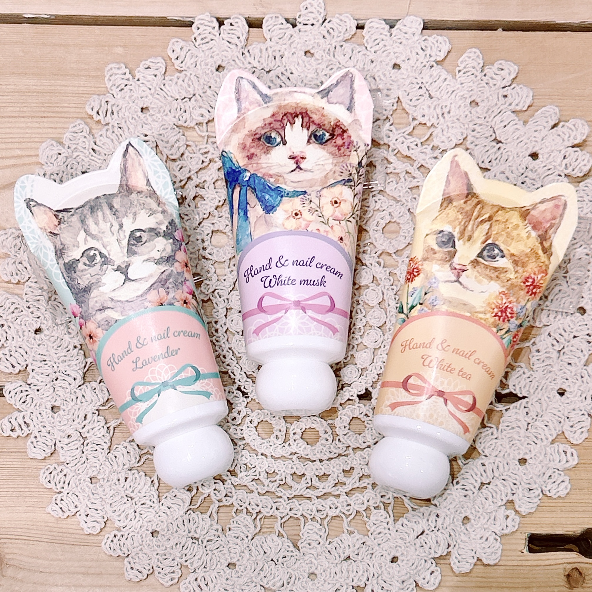 ネコ型のデザインが可愛らしいハンドクリームです。癒される優しい香りが広がります。