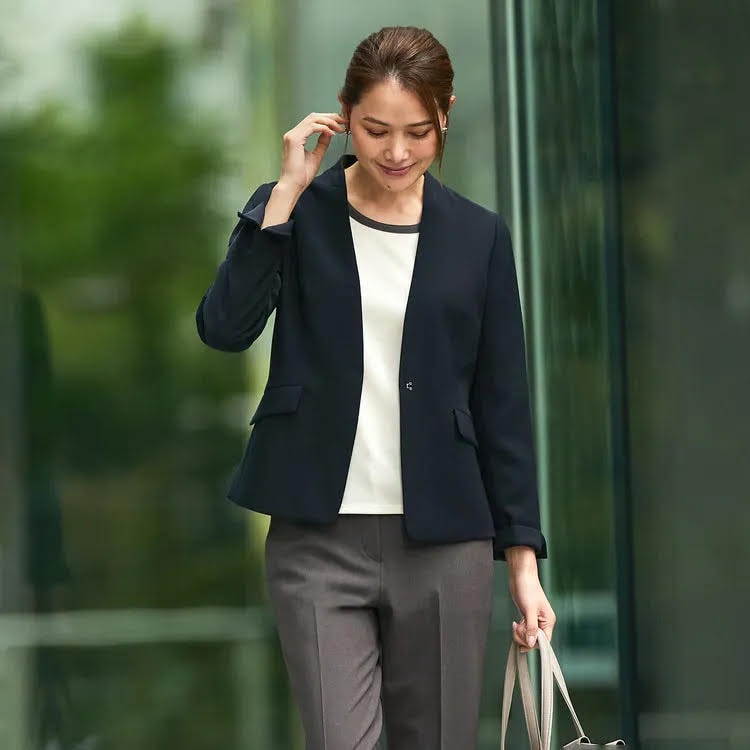 お仕事でも使いやすい定番色で、インナーやボトムスを変えるだけでコーディネートの幅が広がります。