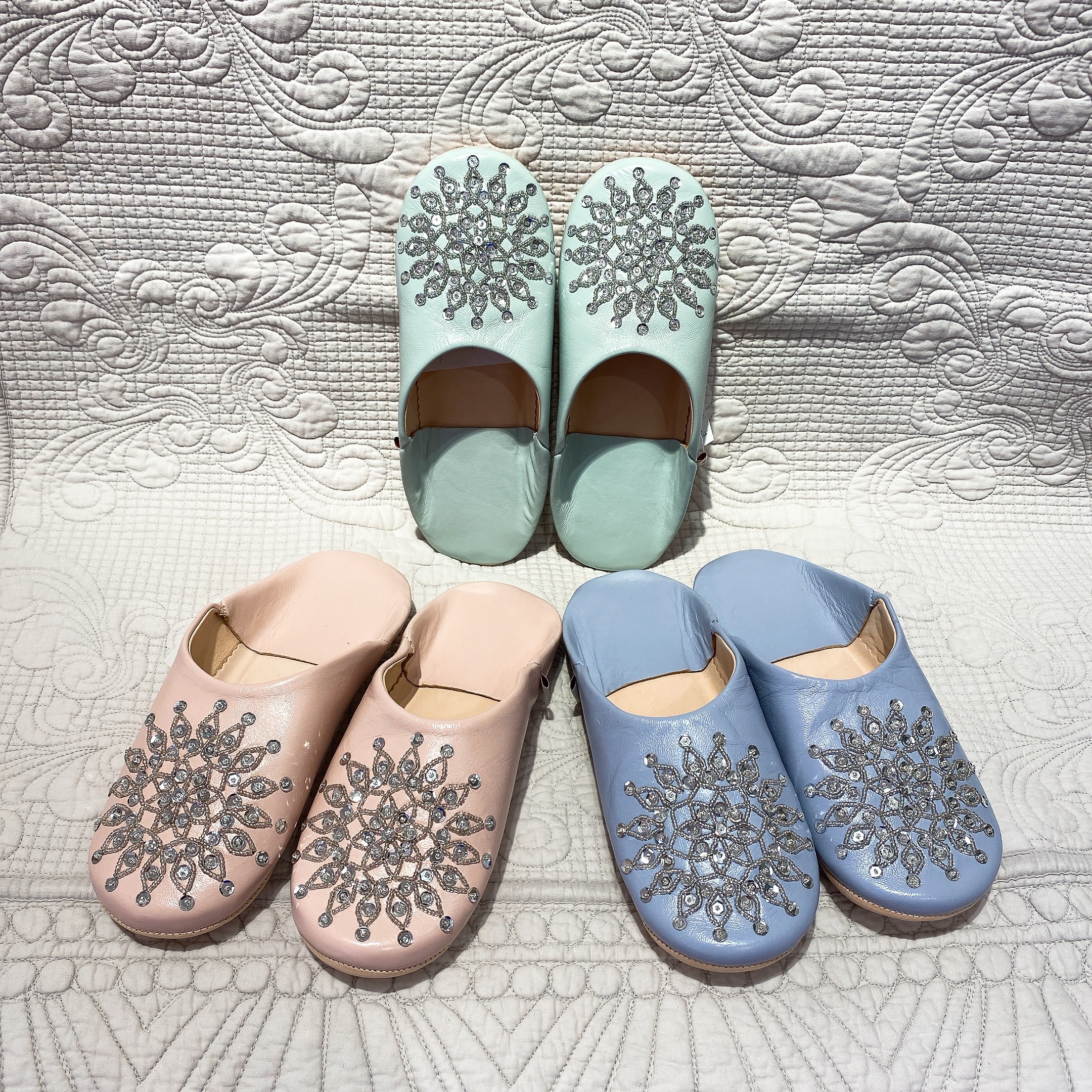 ビーズとスパンコールを施した華やかなバブーシュです。