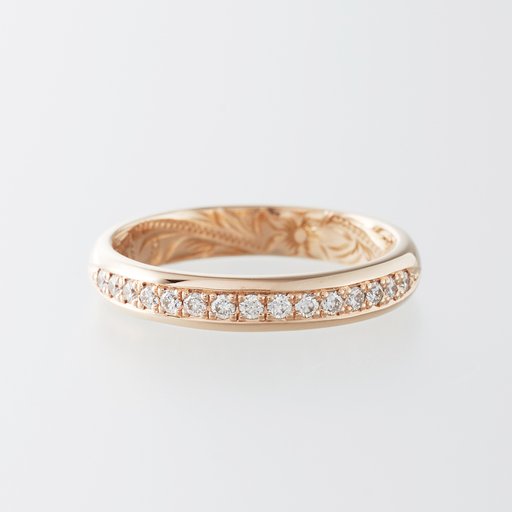 幅3mmの甲丸リングという、指に優しくなじむベーシックなフォルムをベースに、上質なダイヤモンドを半周にわたりセッティングしました。