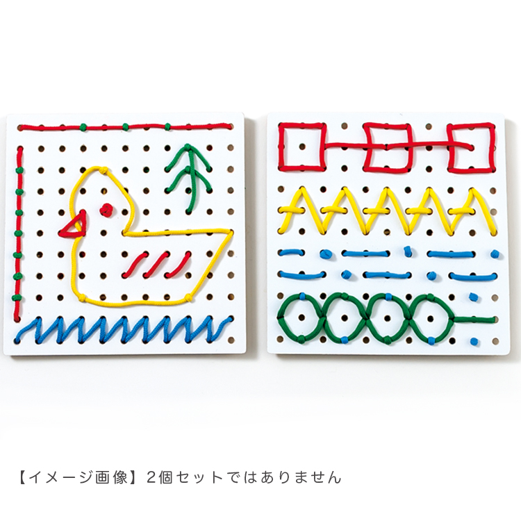 白い穴の開いた板にひもを通して絵を描きます。